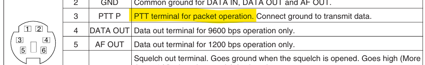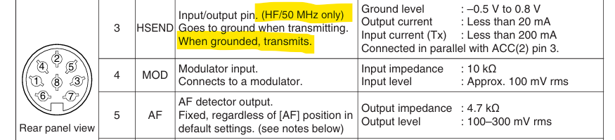 i had one as a remote base on my 6m/70cm repeater and while it was CI-V controlled, the ptt source was traditional grounded pin. hsend and vsend lines tied together.