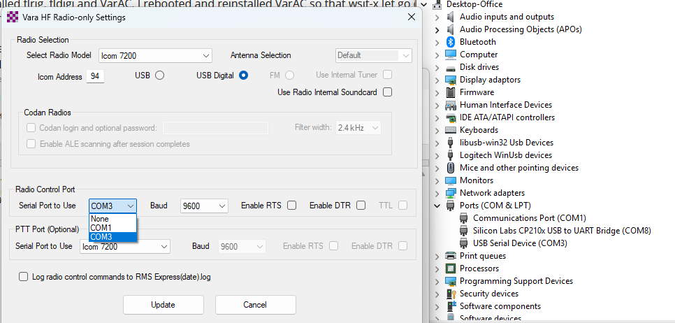 However when setting up FLRig the COM8 just doesn’t show up as a drop down option, and the same in Winlink VARA HF settings. Similar story in N1MM. It seems like certain software just doesn’t want to see the COM port? I’ve tried restarting the PC and seeing if it was just locked to other software, but hasn’t changed.