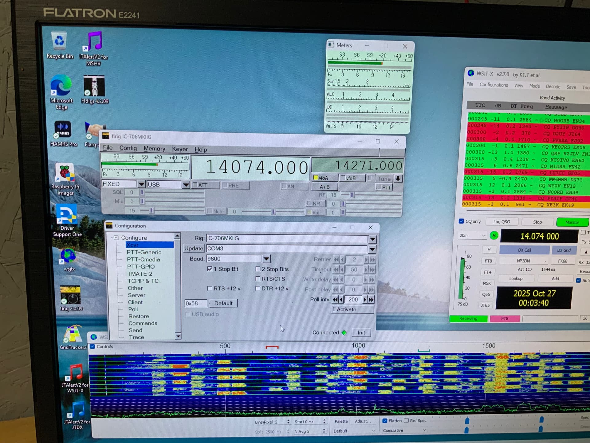When using intermediary software like FlRig, the best option for PTT is via the CAT command, which is the same mechanism as used for other aspects of transceiver control. Unfortunately, IC-706 doesn’t offer a CAT command for PTT so the only option is to use hardware PTT line. With Digirig Mobile that is controlled by PTT.