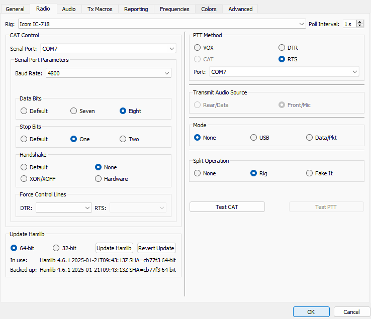 in wsjt-x, on the ‘radio’ page of the settings, there are ‘test cat’ and ‘test ptt’ buttons.