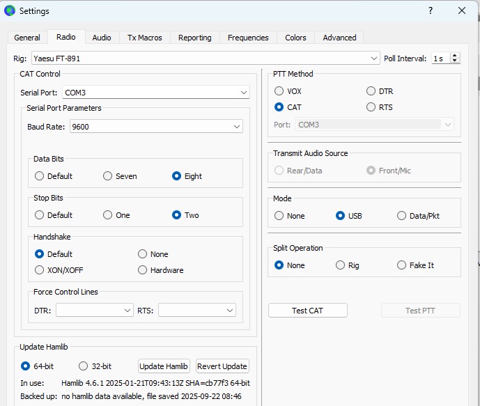 WSJT-X cat controls FT891 via DR891, but no Band activity is shown. It was working initially. Upon first install, band activity was working, but no cat control. Port is com3 and mode is USB.